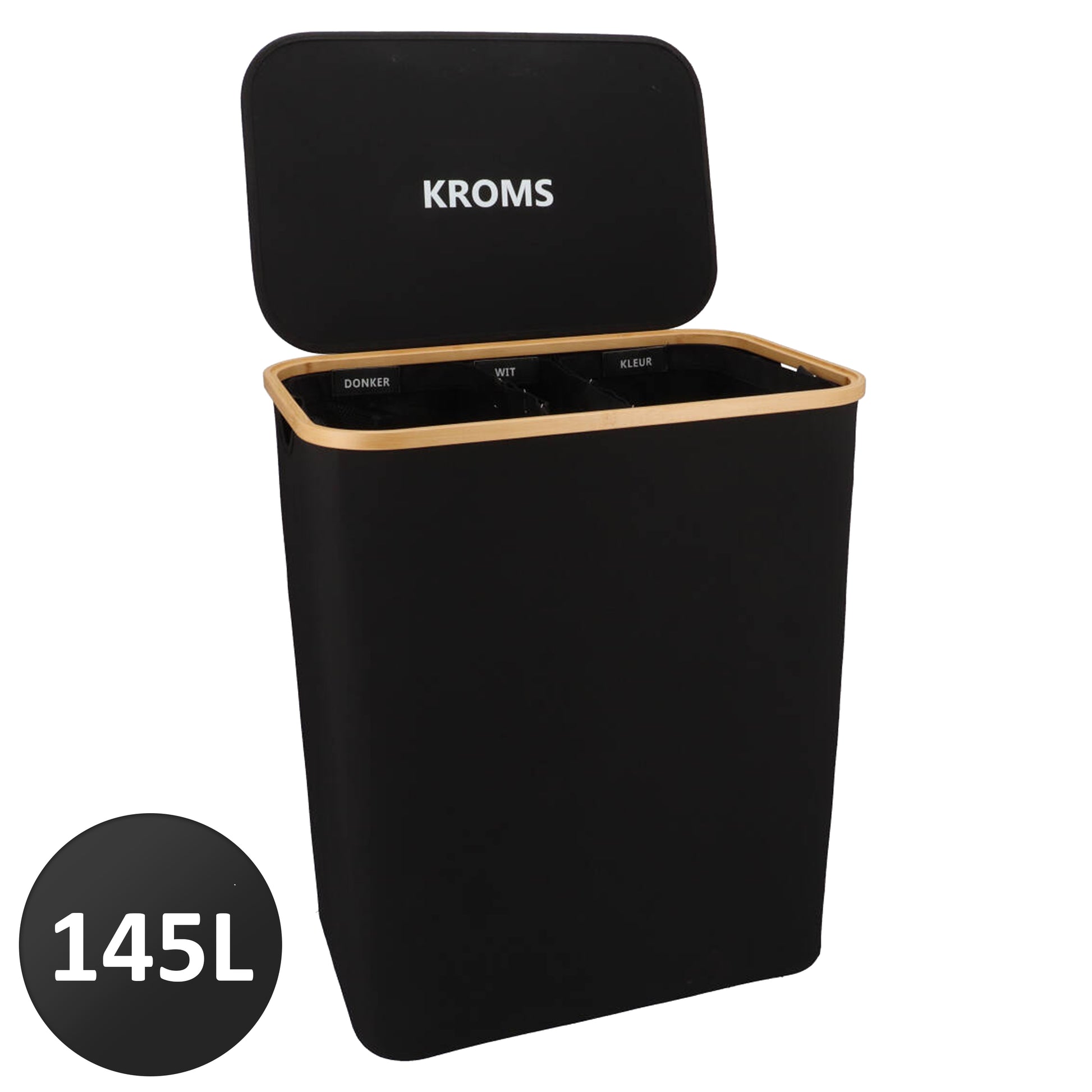 Der Wäschekorb von KROMS verfügt mit seinen drei geräumigen Innentaschen über ein Gesamtvolumen von 145 Litern. Die drei Beutel sind mit Beschriftungen versehen: weiße, schwarze und bunte Wäsche. Dank des Klettverschlusssystems können Sie diese Taschen ganz einfach anbringen oder abnehmen. Ist die Tüte voll? Anschließend vom Klettverschluss lösen und die Tasche bequem entnehmen. Das Waschen kann beginnen!