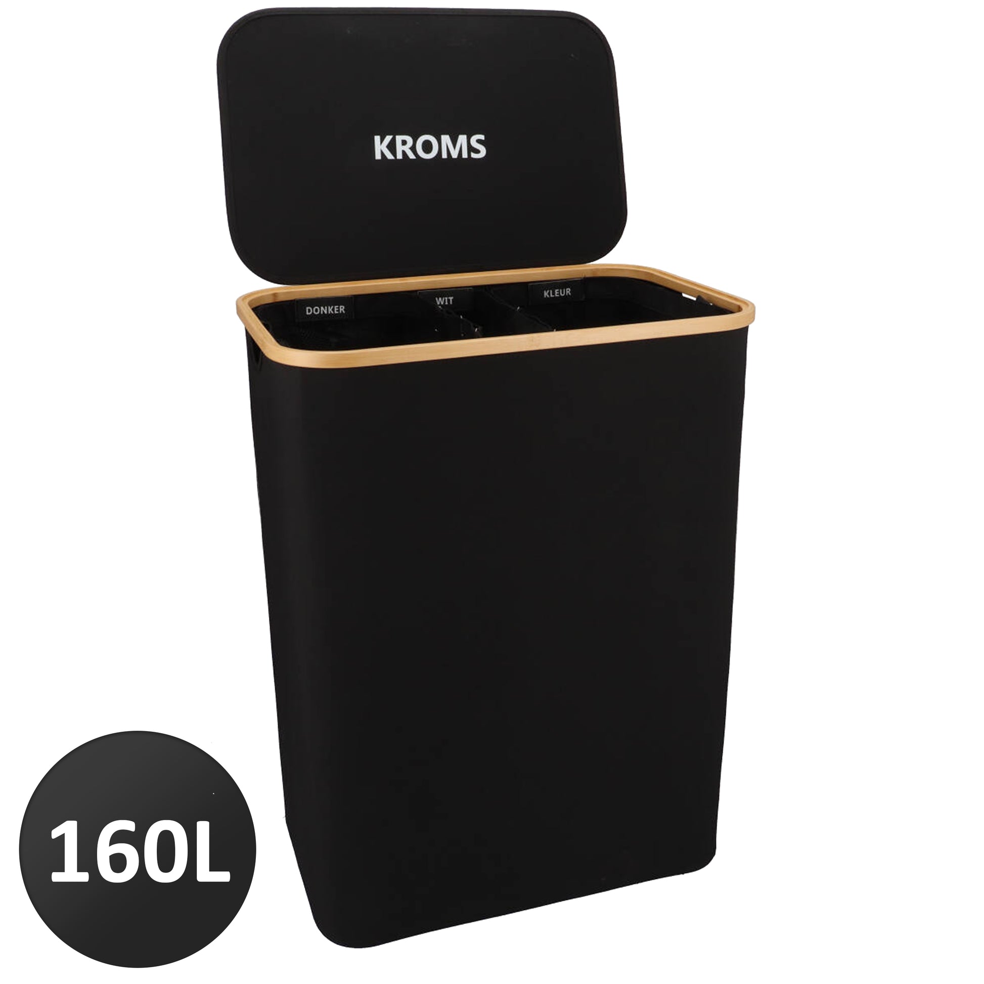 Le panier à linge KROMS a une capacité totale de 145 litres avec ses trois poches spacieuses à l'intérieur. Les trois sacs sont munis d'étiquettes : linge blanc, noir et couleur. Vous pouvez facilement attacher ou détacher ces sacs grâce au système Velcro. Y a-t-il un sac plein ? Retirez ensuite le velcro et retirez facilement le sac. Le lavage peut commencer !