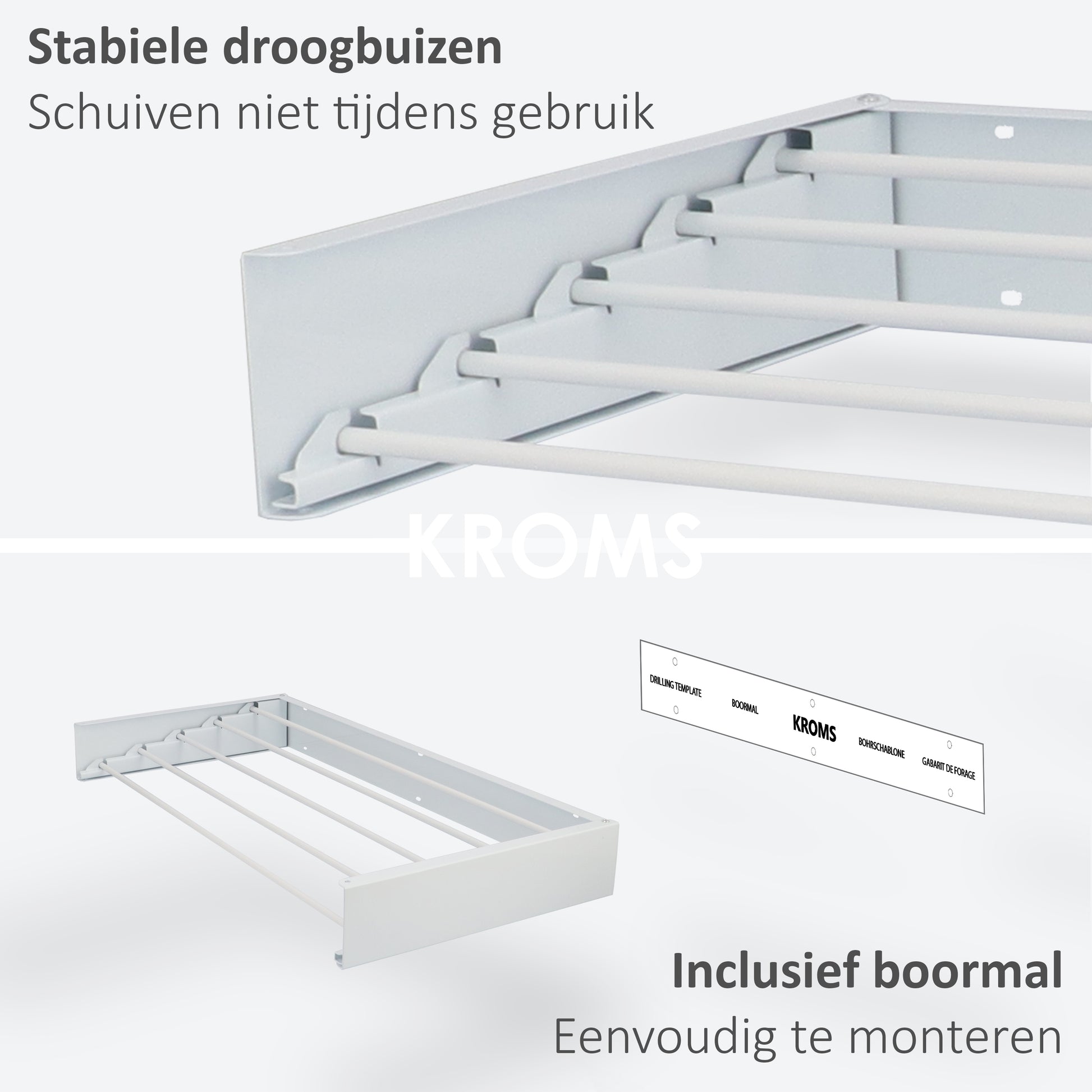 Ken je dat gevoel? De wasmachine is klaar en je moet dat grote onhandige droogrek weer tevoorschijn halen. Je hebt hier écht geen zin in! Het moet toch gebeuren en je loopt met frisse tegenzin naar het droogrek en zet hem in elkaar. Natuurlijk lukt dit niet in één keer en het liefst gooi je dat droogrek je huis uit. Wij zouden zeggen; doe dat gerust, want hier is het KROMS Wanddroogrek!