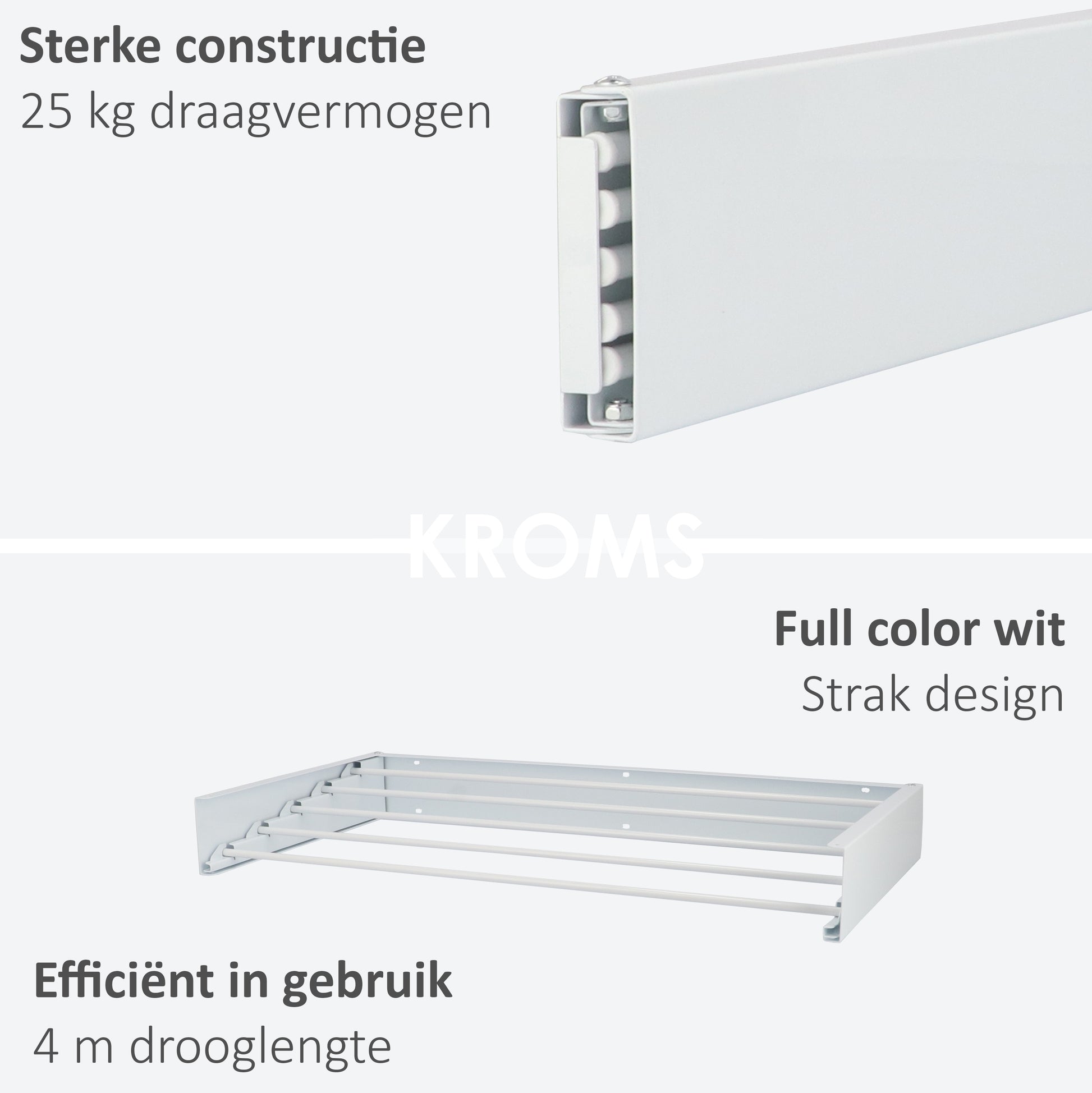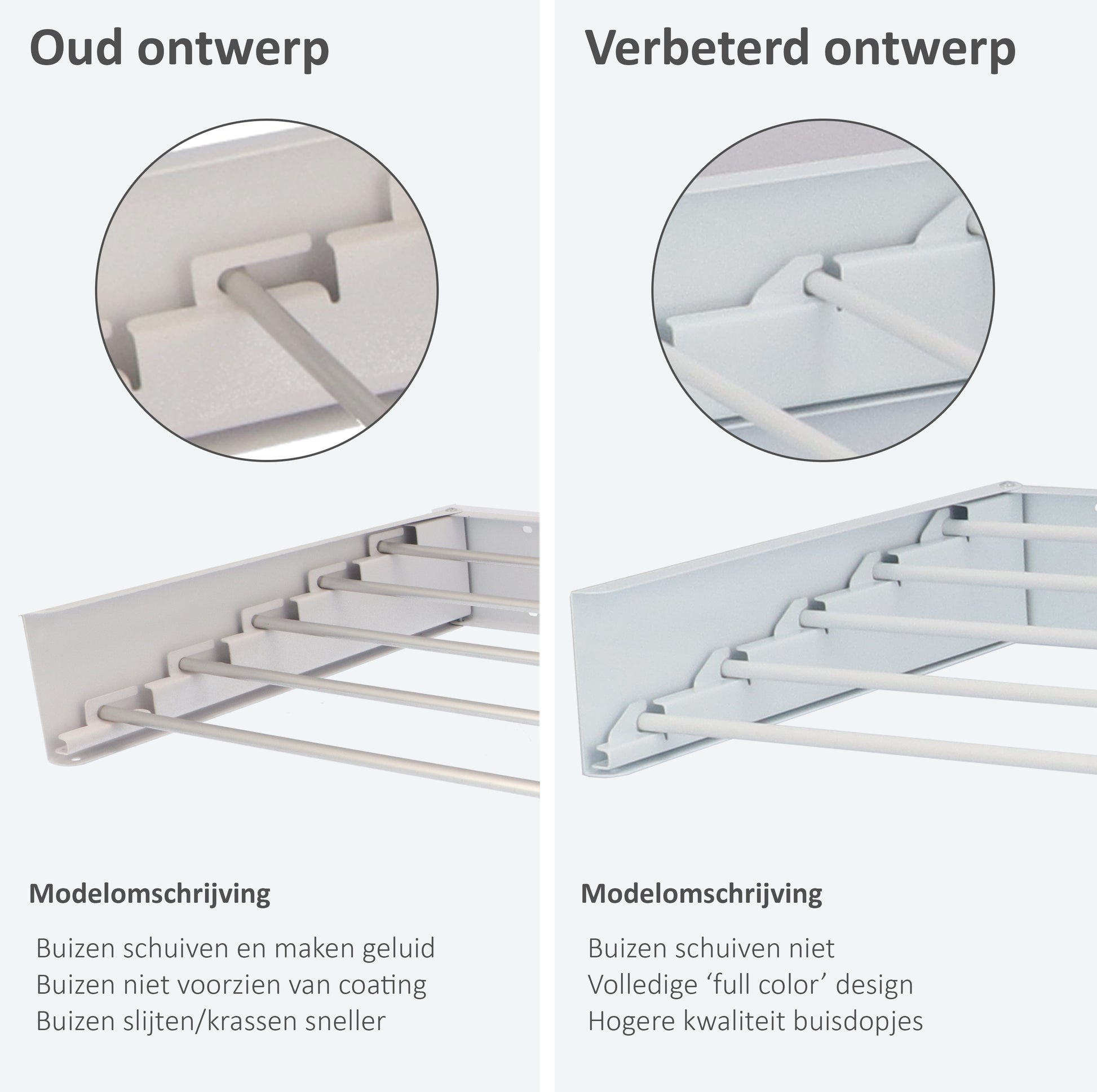 Het KROMS wanddroogrek full color wit is nieuw op de markt en een geupdate versie! Zo zie je geen zilverkleurige aluminium constructie van binnen, maar is heel het rek wit (zowel van binnen als van buiten). Ook zitten de stalen buizen nu vast in de constructie zodra het rek is uitgeklapt. Hierdoor zit het niet meer los en gaat het niet verschuiven wanneer je de was ophangt.