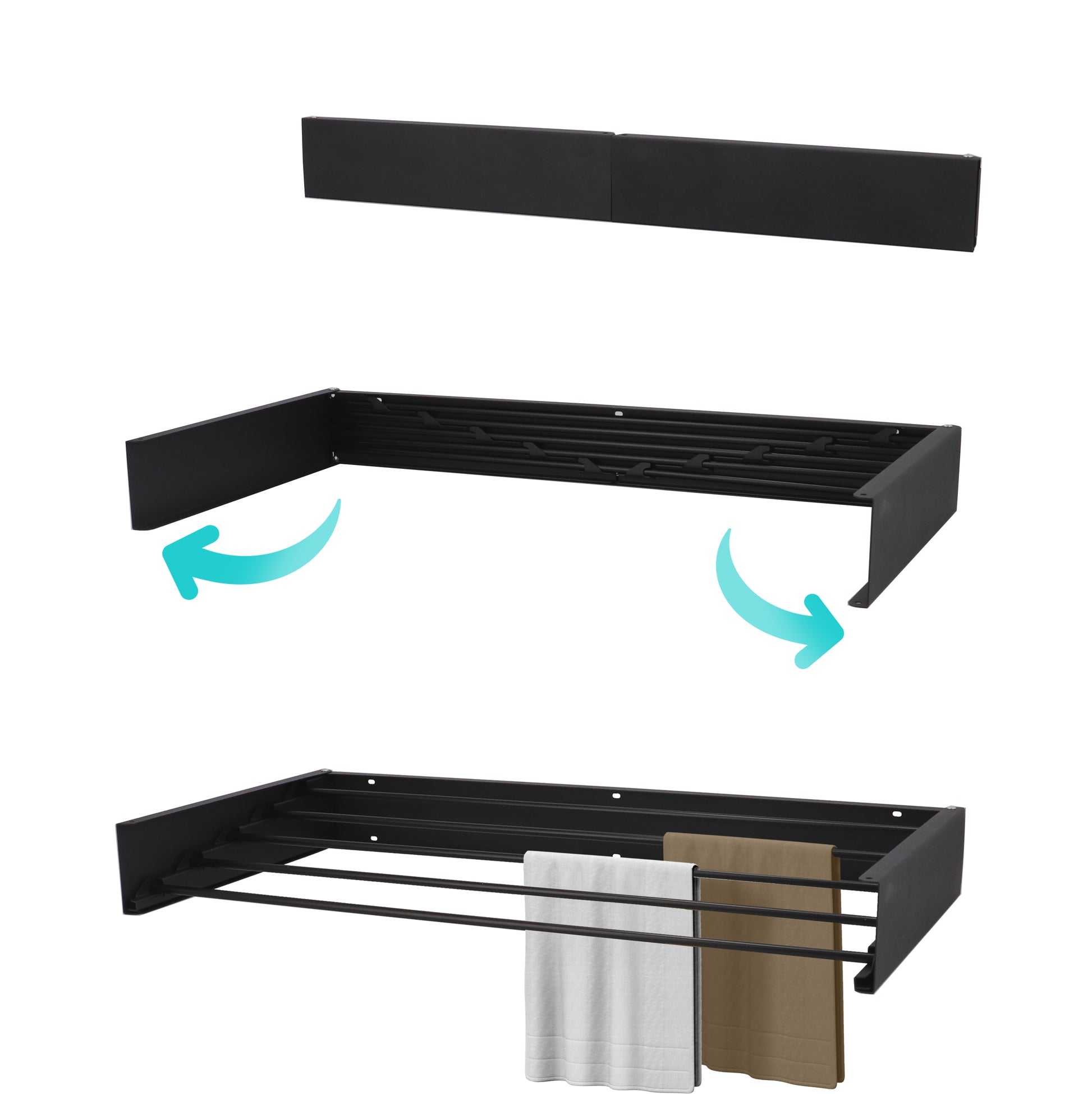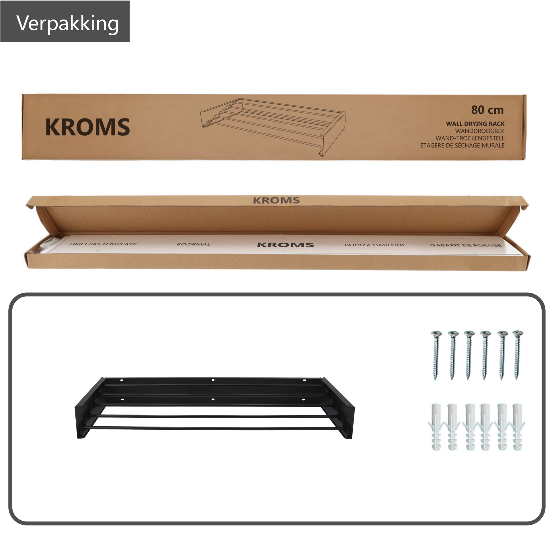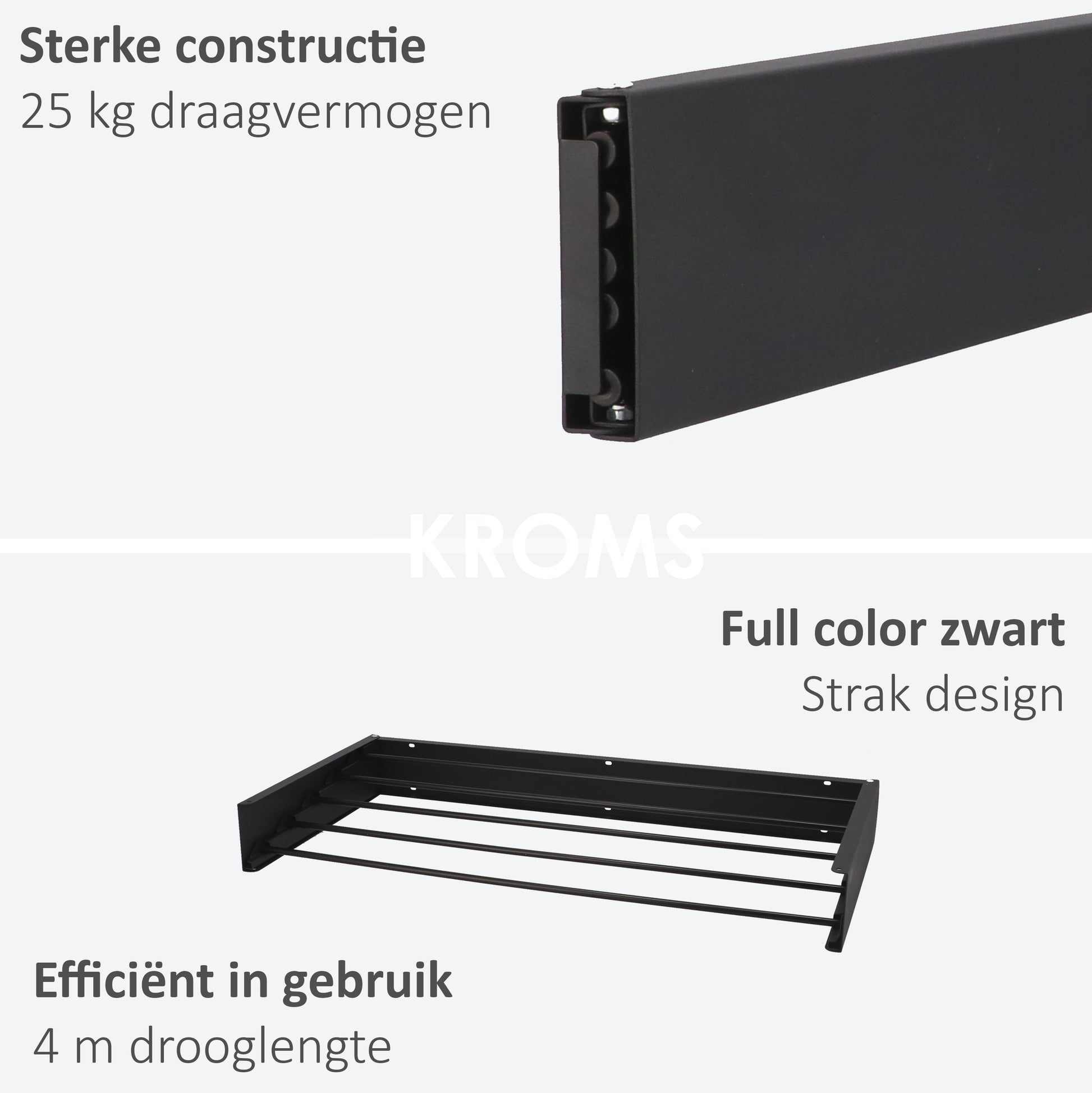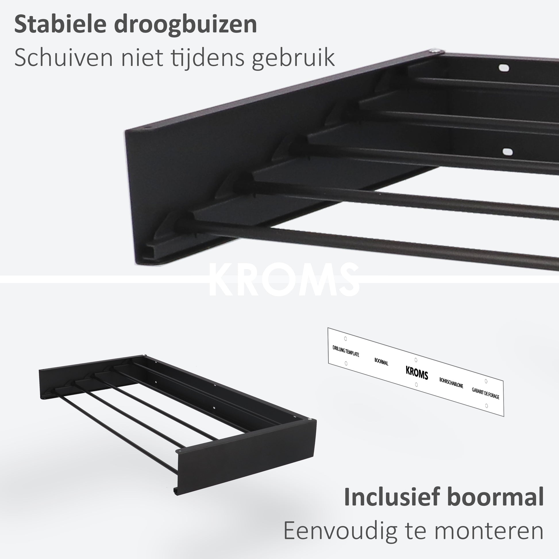 Het KROMS wanddroogrek full color zwart is nieuw op de markt en een geupdate versie! Zo zie je geen zilverkleurige aluminium constructie van binnen, maar is heel het rek zwart (zowel van binnen als van buiten). Ook zitten de stalen buizen nu vast in de constructie zodra het rek is uitgeklapt. Hierdoor zit het niet meer los en gaat het niet verschuiven wanneer je de was ophangt.
