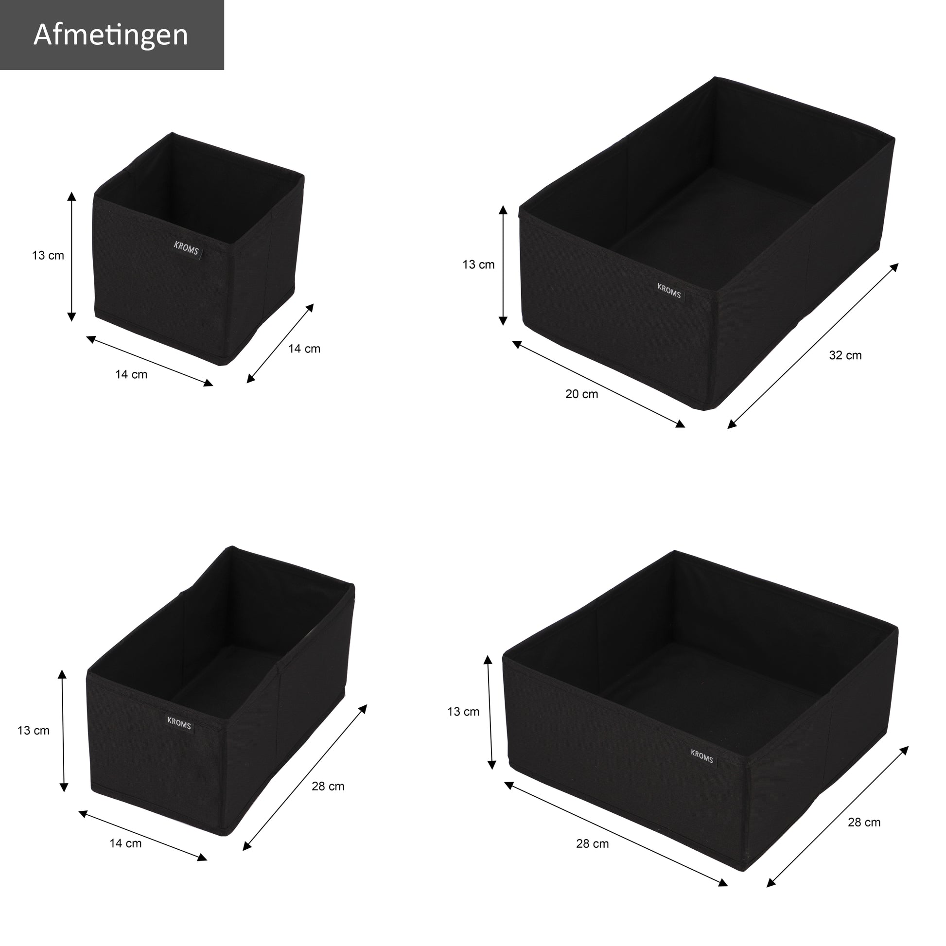 Bij KROMS geloven we dat een georganiseerd huis bijdraagt aan een ontspannen hoofd. Daarom is deze set ontworpen als een slim, modulair kleding organizer opbergsysteem dat jou helpt om grip te houden op je spullen, hoe druk je leven ook is. De boxen zijn stevig, mooi afgewerkt en volledig opvouwbaar wanneer je ze even niet nodig hebt. Daarnaast zijn ze waterafstotend, zodat je je nooit zorgen hoeft te maken over vocht of nare geurtjes. Zelfs in een vochtige kast of badkamer blijven de boxen fris. Schimmel krijgt geen kans. Zo combineert deze set praktische functionaliteit met de moderne, rustige uitstraling die je van KROMS kent.