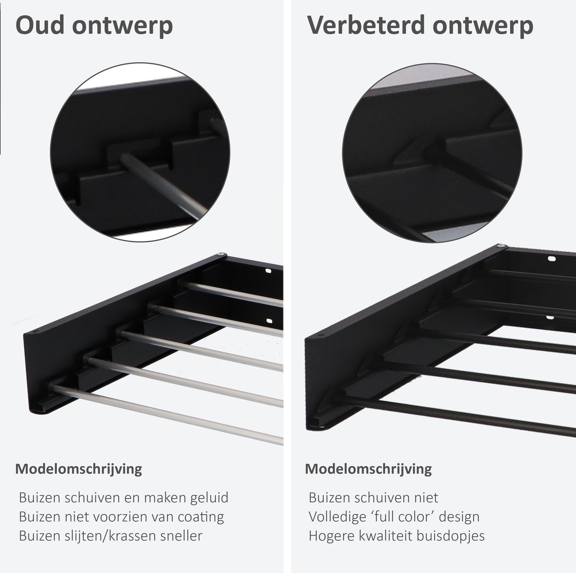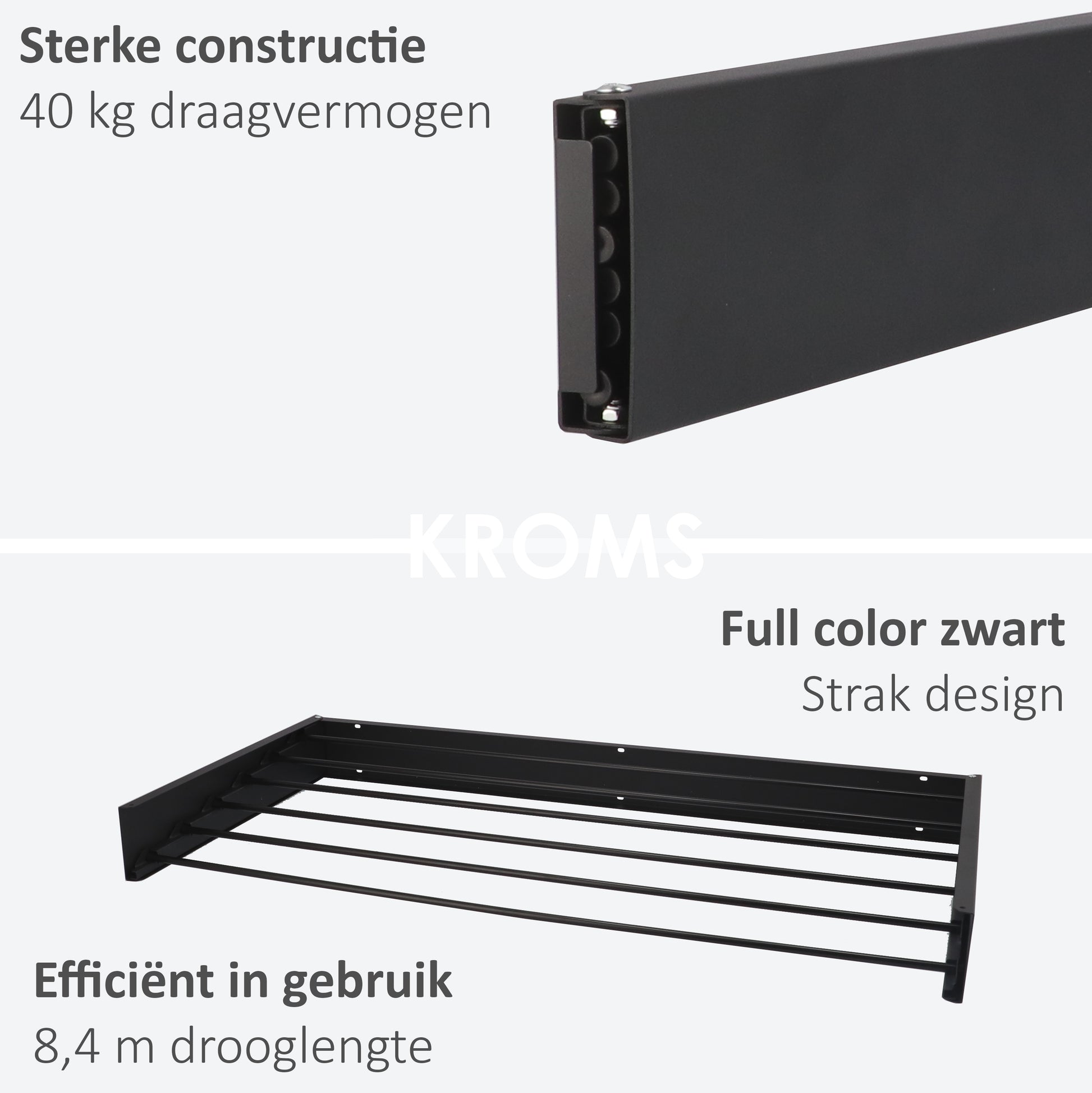 Het KROMS wanddroogrek full color zwart is nieuw op de markt en een geupdate versie! Zo zie je geen zilverkleurige aluminium constructie van binnen, maar is heel het rek zwart (zowel van binnen als van buiten). Ook zitten de stalen buizen nu vast in de constructie zodra het rek is uitgeklapt. Hierdoor zit het niet meer los en gaat het niet verschuiven wanneer je de was ophangt. Daarnaast heeft het rek geen drooglengte van 5 meter (zoals de meeste rekken), maar van 8,4 meter!