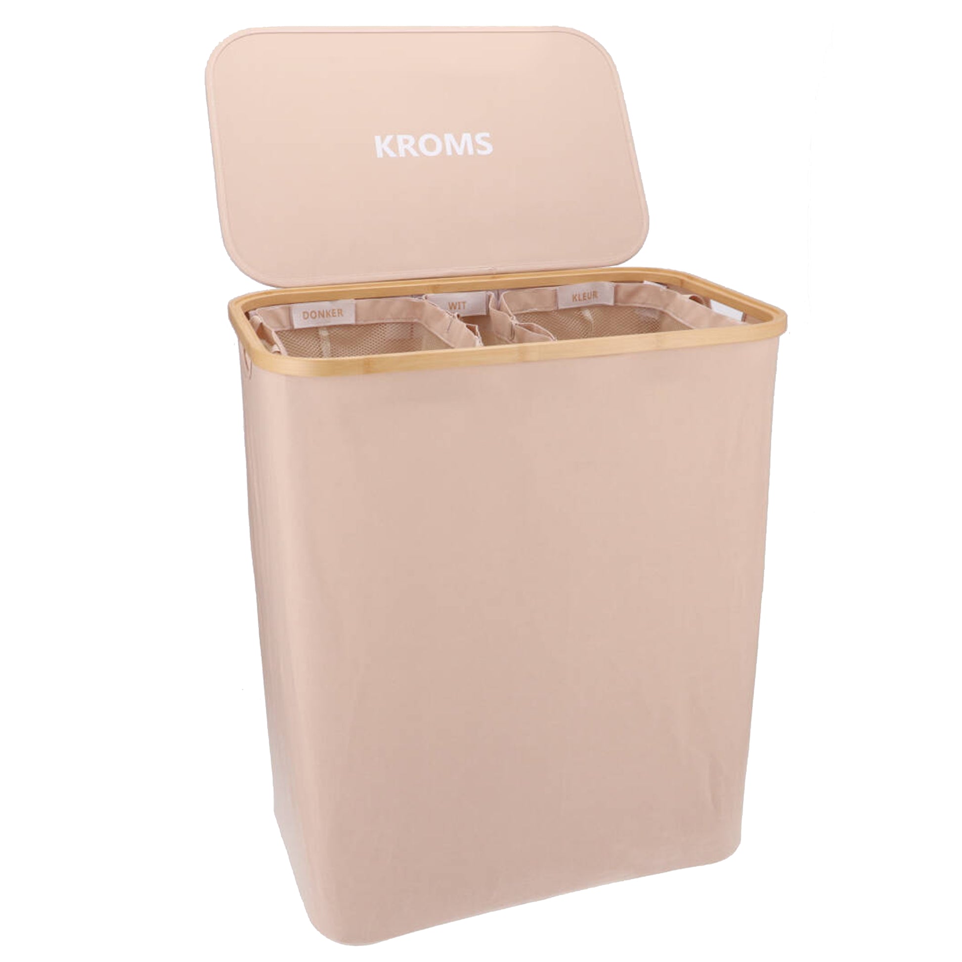 De KROMS wasmand heeft met zijn drie ruime zakken in de binnenkant een totale inhoud van 145 liter. De drie zakken zijn voorzien met de labels: witte, zwarte en gekleurde was. Je kunt deze zakken makkelijk bevestigen of lostrekken dankzij het klittenbandsysteem. Zit er een zak vol? Trek deze dan los van het klittenband en haal gemakkelijk de zak eruit. Het wassen kan beginnen!