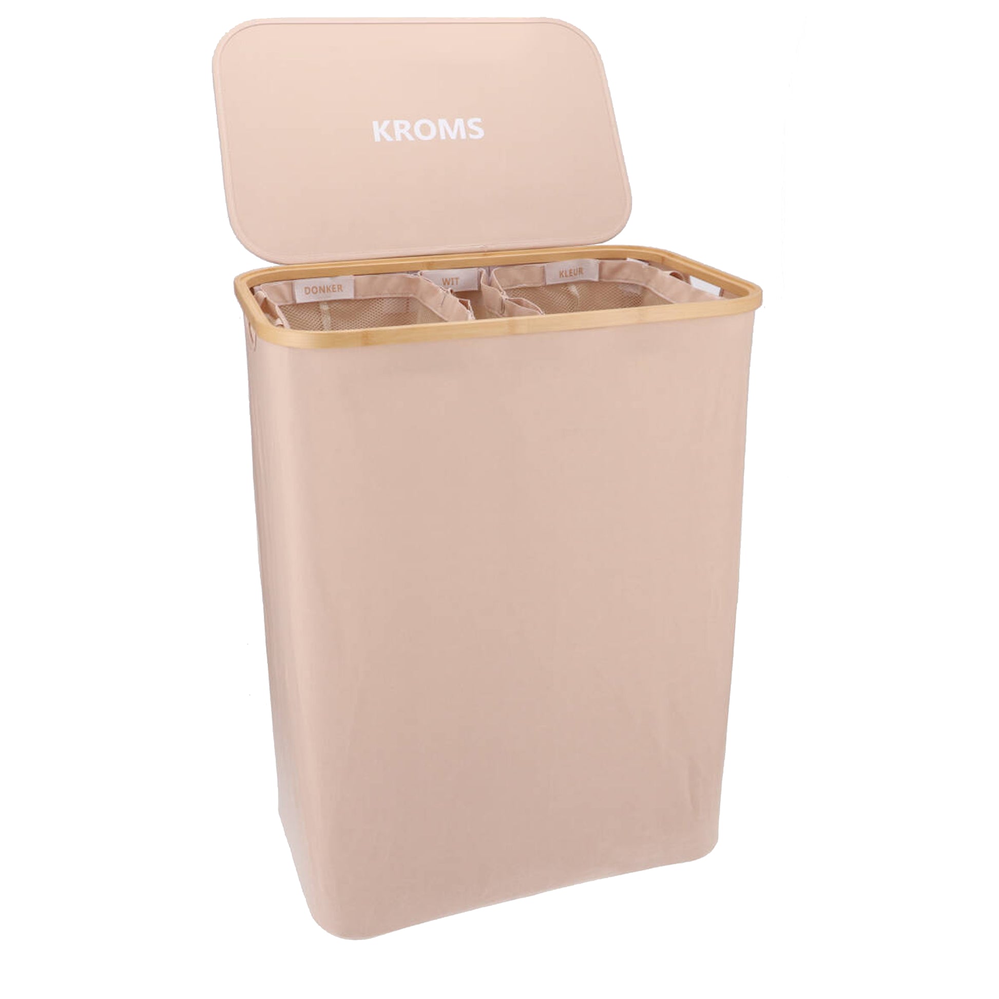 De KROMS wasmand heeft met zijn drie ruime zakken in de binnenkant een totale inhoud van 160 liter. De drie zakken zijn voorzien met de labels: witte, zwarte en gekleurde was. Je kunt deze zakken makkelijk bevestigen of lostrekken dankzij het klittenbandsysteem. Zit er een zak vol? Trek deze dan los van het klittenband en haal gemakkelijk de zak eruit. Het wassen kan beginnen!