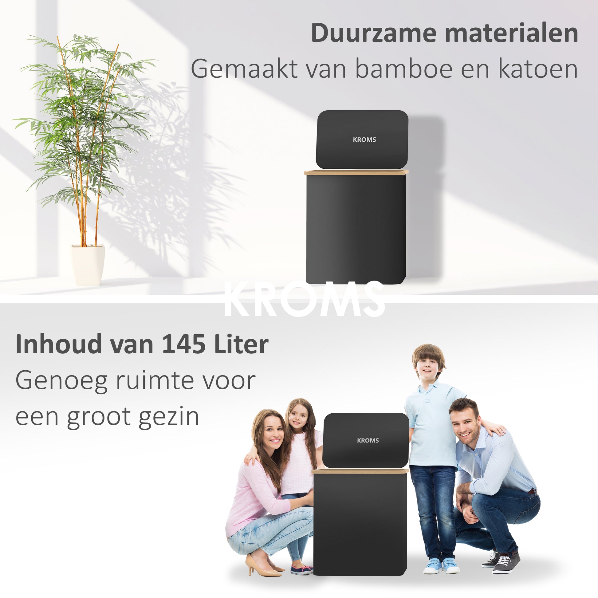 De KROMS wasmand heeft met zijn drie ruime zakken in de binnenkant een totale inhoud van 145 liter. De drie zakken zijn voorzien met de labels: witte, zwarte en gekleurde was. Je kunt deze zakken makkelijk bevestigen of lostrekken dankzij het klittenbandsysteem. Zit er een zak vol? Trek deze dan los van het klittenband en haal gemakkelijk de zak eruit. Het wassen kan beginnen!