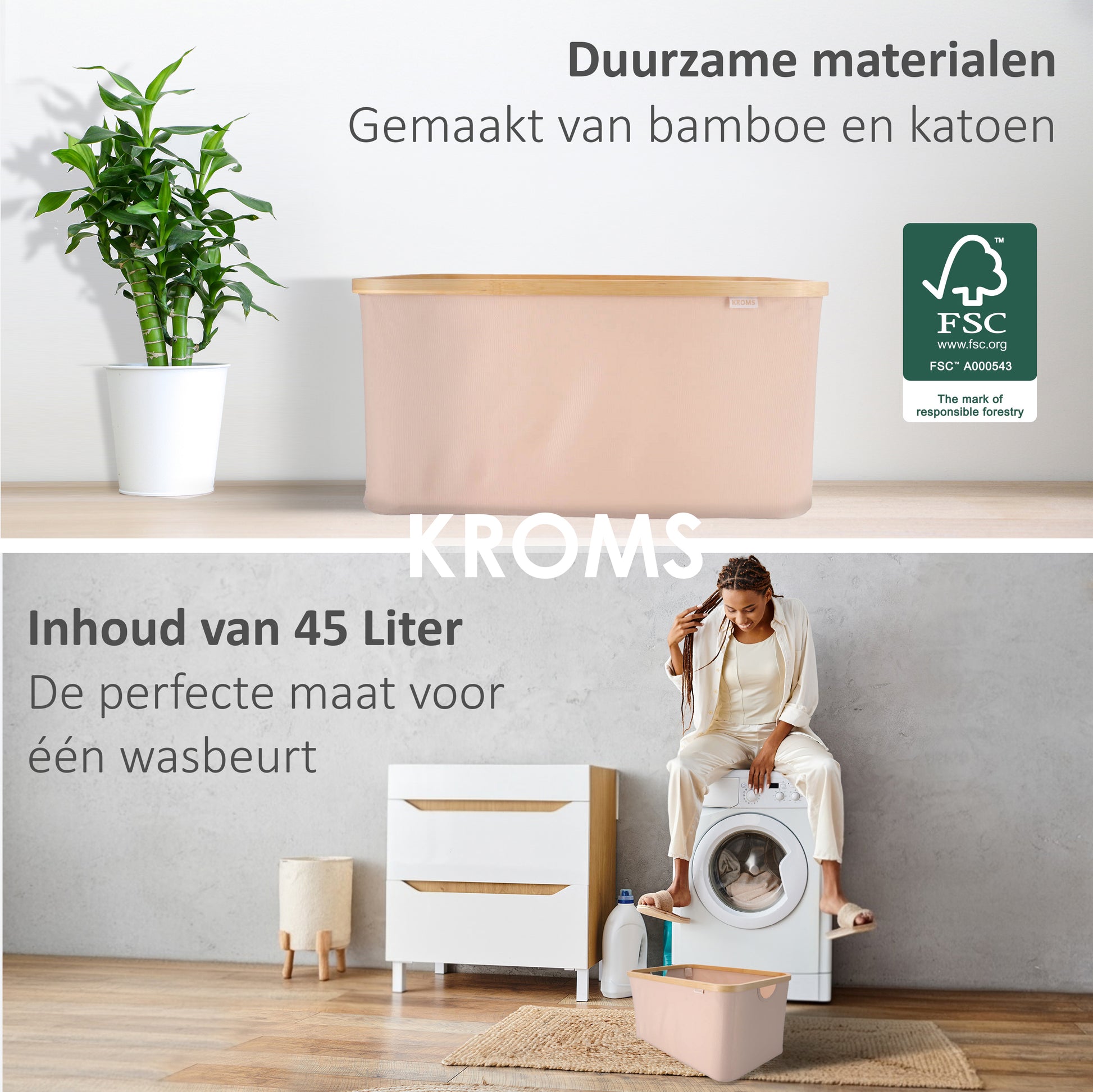 Naast onze populaire grote sorteerwasmand van 145L én 160L hebben we nu ook een compact model: de KROMS 45 liter wasmand. Perfect voor het moment dat de was schoon is en klaar om gevouwen te worden. Dankzij het lichte gewicht, de comfortabele handgrepen en het compacte formaat neem je hem moeiteloos mee door het hele huis.