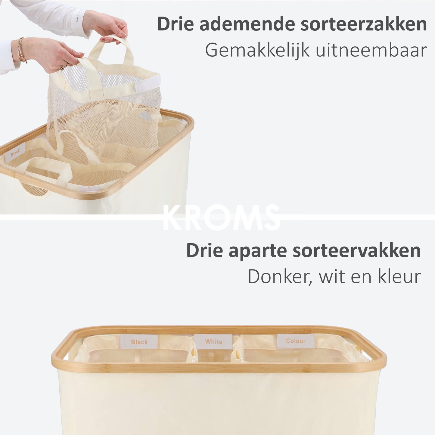 Ben jij die ongeorganiseerde wasmand die uitpuilt ook zo zat? Iedere keer weer die wasmand op zijn kop om de was uit te sorteren voordat je een wasje kan draaien. Het blijft altijd weer een gedoe! Daar hebben wij wat voor bedacht; de KROMS wasmand drie vakken bamboe!