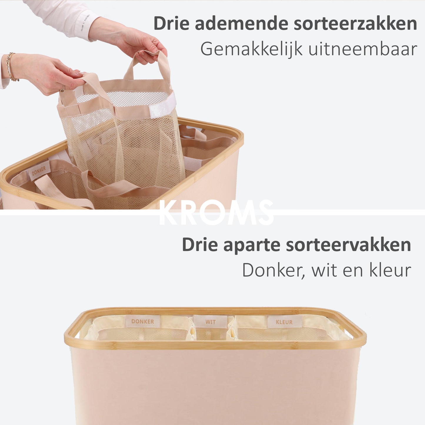 Ben jij die ongeorganiseerde wasmand die uitpuilt ook zo zat? Iedere keer weer die wasmand op zijn kop om de was uit te sorteren voordat je een wasje kan draaien. Het blijft altijd weer een gedoe! Daar hebben wij wat voor bedacht; de KROMS wasmand drie vakken bamboe!